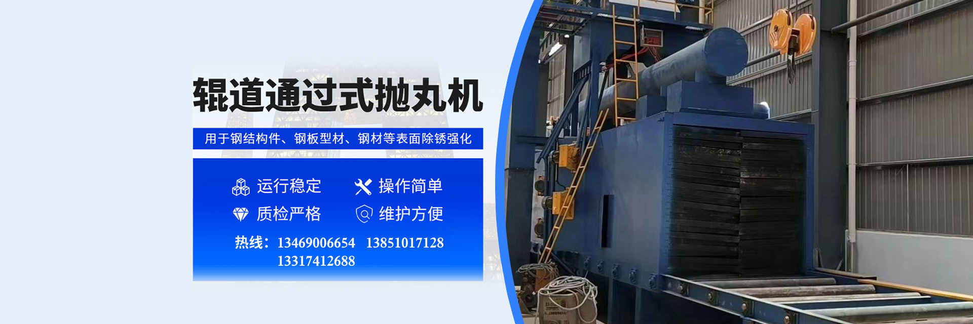 公司從設計、鑄造。金工、裝配及安裝、調試實行一條龍服務,形成Q31系列滾筒式拋丸機、Q32系列履帶式拋丸機、Q35系列轉臺式拋丸機、Q37系列吊鉤式拋丸機、Q38系列吊鏈式拋丸機、Q37系列預處理線、HP系列拋丸機、通過式拋丸機、02系列自動拋丸機械、機械輸送人一拋丸房、蜂窩氣力回收人工拋丸房、砂處理線、濕式除塵、旋風除塵、袋式除塵、布袋除塵等多種產品系列。